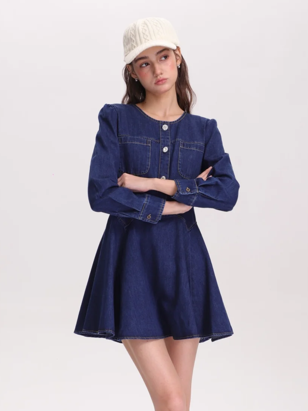 【即納】フィットアンドフレアデニムミニワンピース(長袖ver)C3363