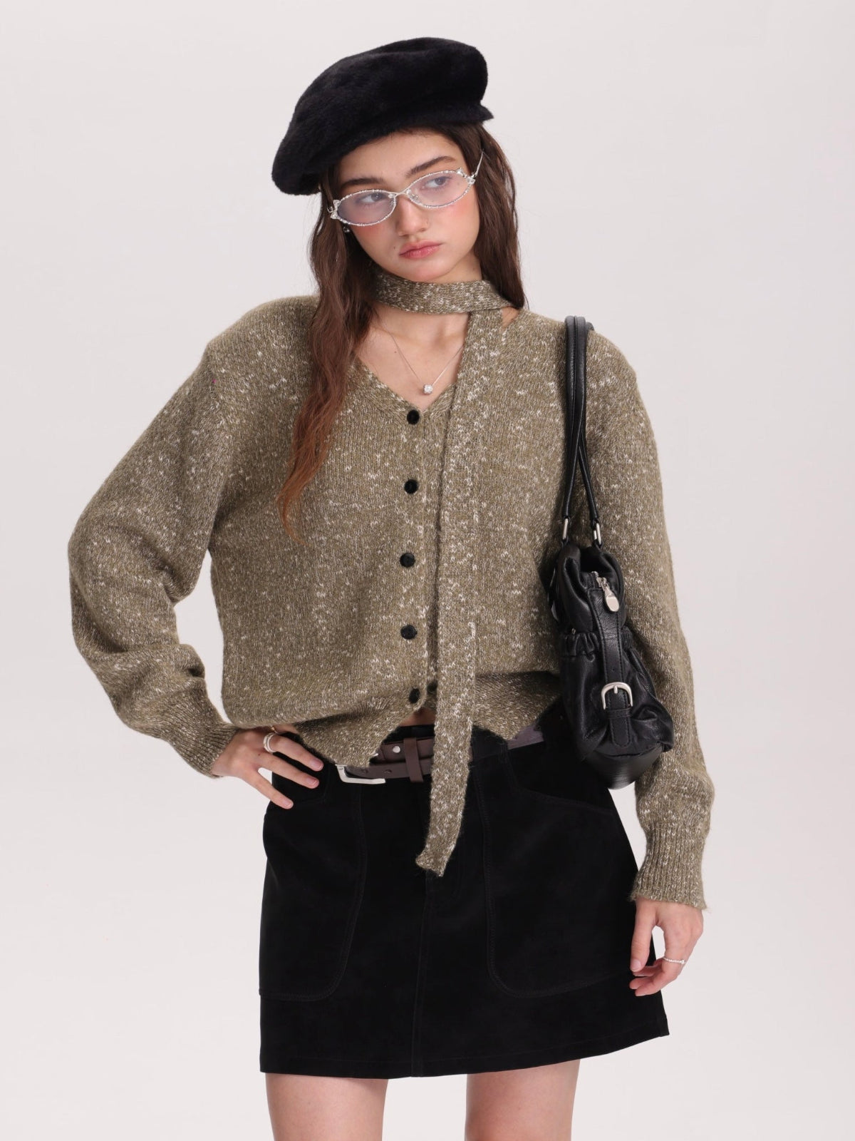 【即納】メランジVカーデ × グレーミニスカートセットT3002